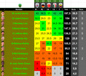 | 1 | Kelvin Oliveira | Delantero, Medio | 30 | 162 | 147.5 | 5 | 19 | 4 | 0 | 0 | 5 | 1,83 | 100.00 | 0.00 | 0.00 |