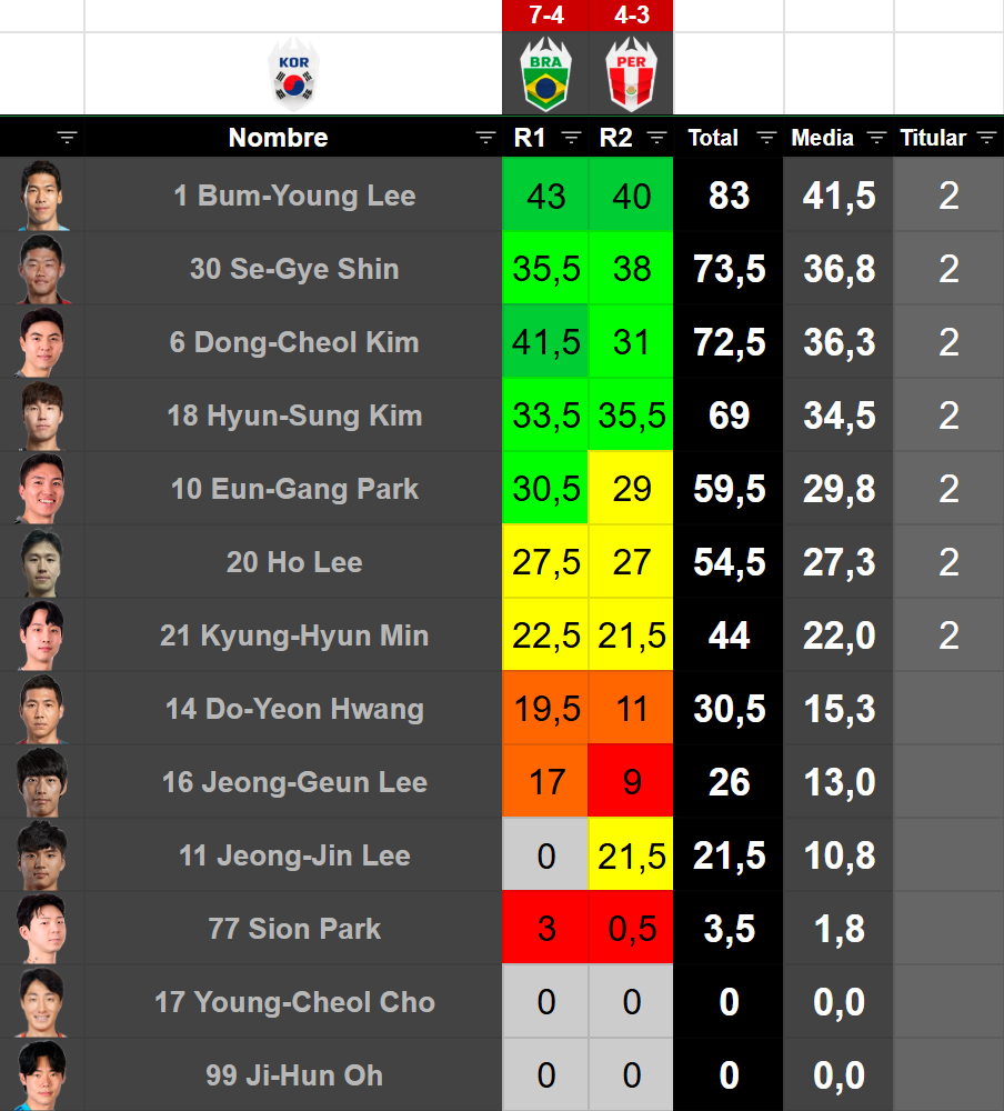 | 2 | Hyun-Sung Kim | Delantero | 36 | 58 | 69 | 2 | 1 | 0 | 0 | 0 | 0 | 1 | 0.00 | 0.00 | 100.00 |