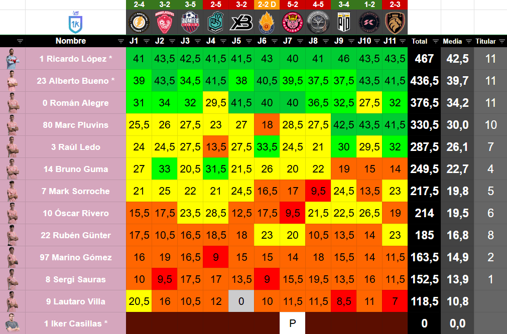 | 1 | Ricardo López * | Portero | 54 | 18 | 467 | 11 | 0 | 3 | 0 | 0 | 1 | 1,87 | 45.45 | 9.09 | 45.45 |