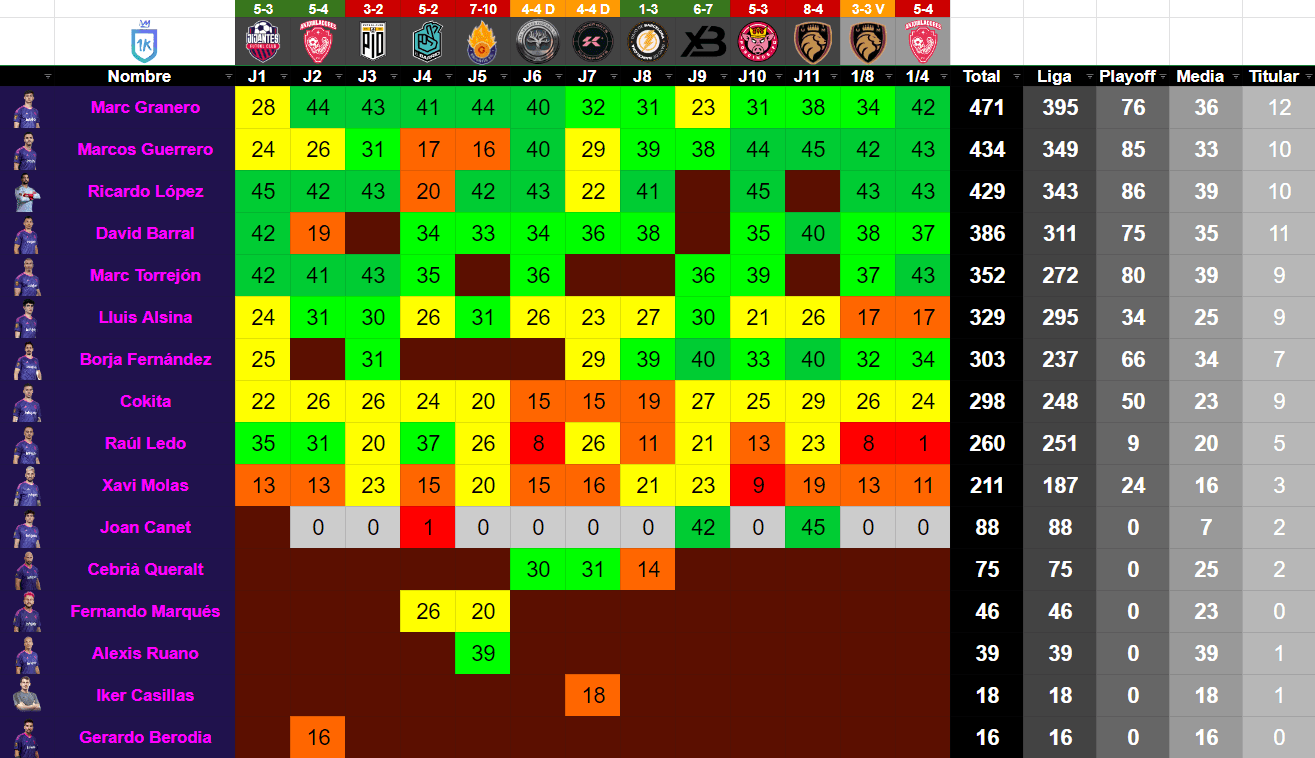 #JugadorPosiciónEdadValor TKMinutosPartidosGolesAsistenciasAmarillasRojasMVPAltura% Victorias% Empates% Derrotas