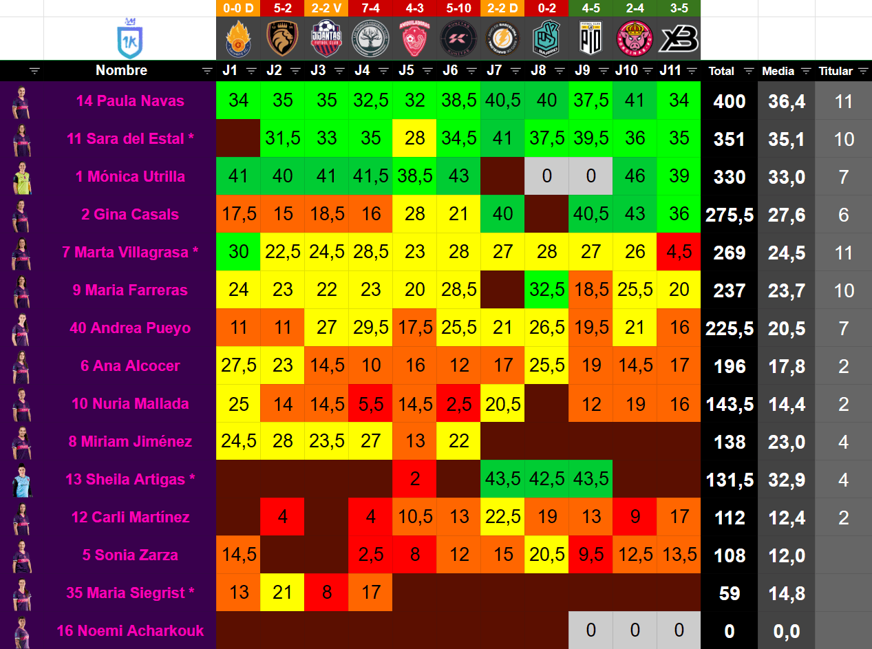 | # | Jugador | Posición | Edad | Valor TK | Minutos | Partidos | Goles | Asistencias | Amarillas | Rojas | MVP | Altura | % Victorias | % Empates | % Derrotas |