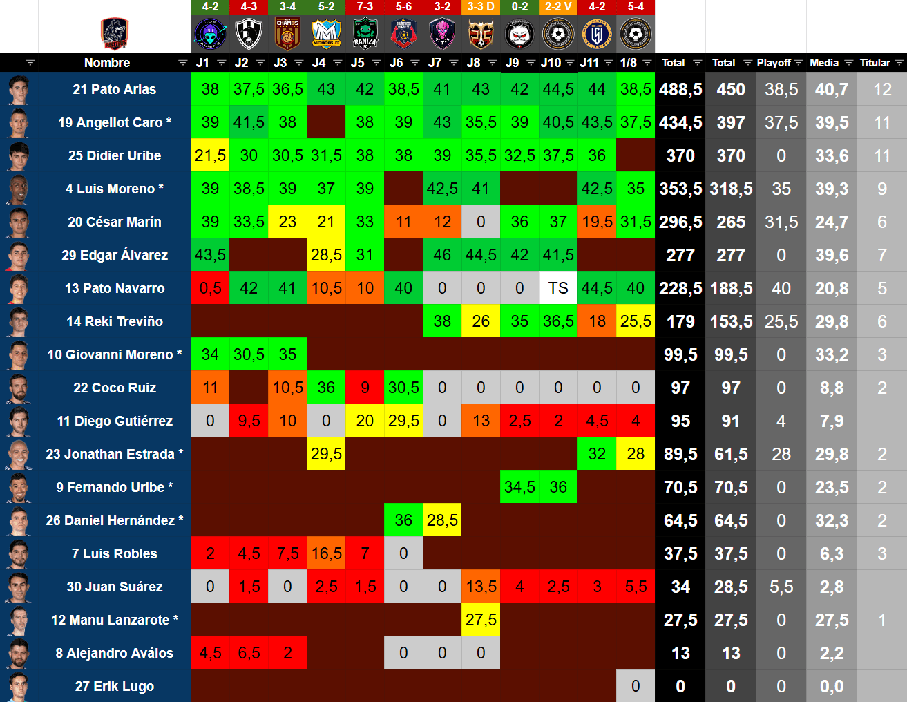 | # | Jugador | Posición | Edad | Valor TK | Minutos | Partidos | Goles | Asistencias | Amarillas | Rojas | MVP | Altura | % Victorias | % Empates | % Derrotas |