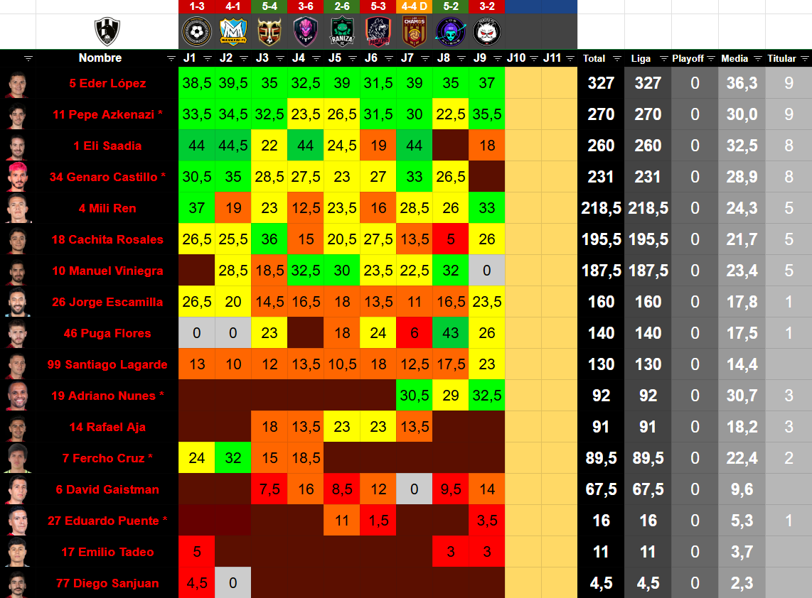| # | Jugador | Posición | Edad | Valor TK | Minutos | Partidos | Goles | Asistencias | Amarillas | Rojas | MVP | Altura | % Victorias | % Empates | % Derrotas |