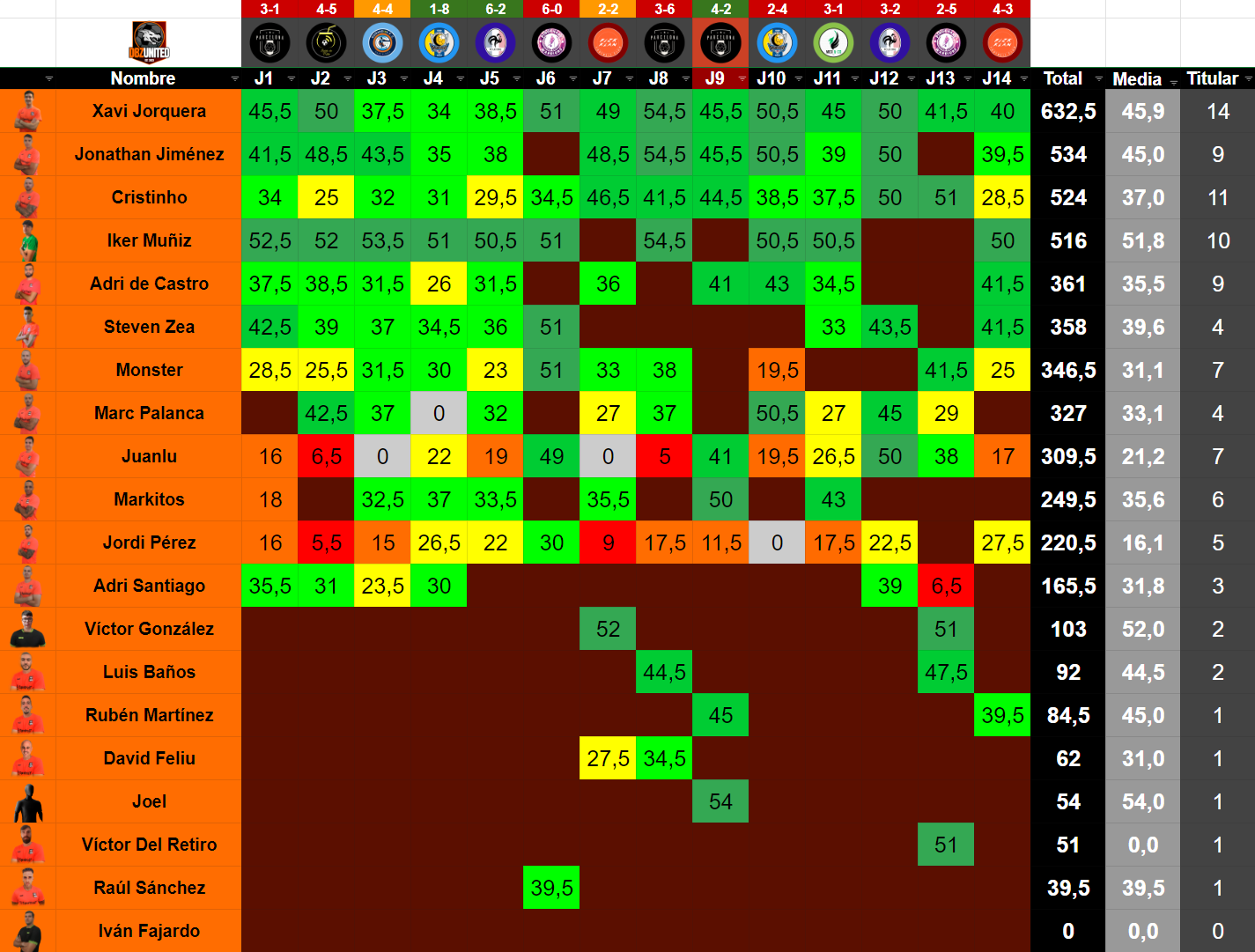 | 10 | JuanluDBZ | Defensa | 37 | 0 | 22.5 | 2 | 0 | 0 | 0 | 0 | 0 | 1 | 0.00 | 0.00 | 100.00 |
