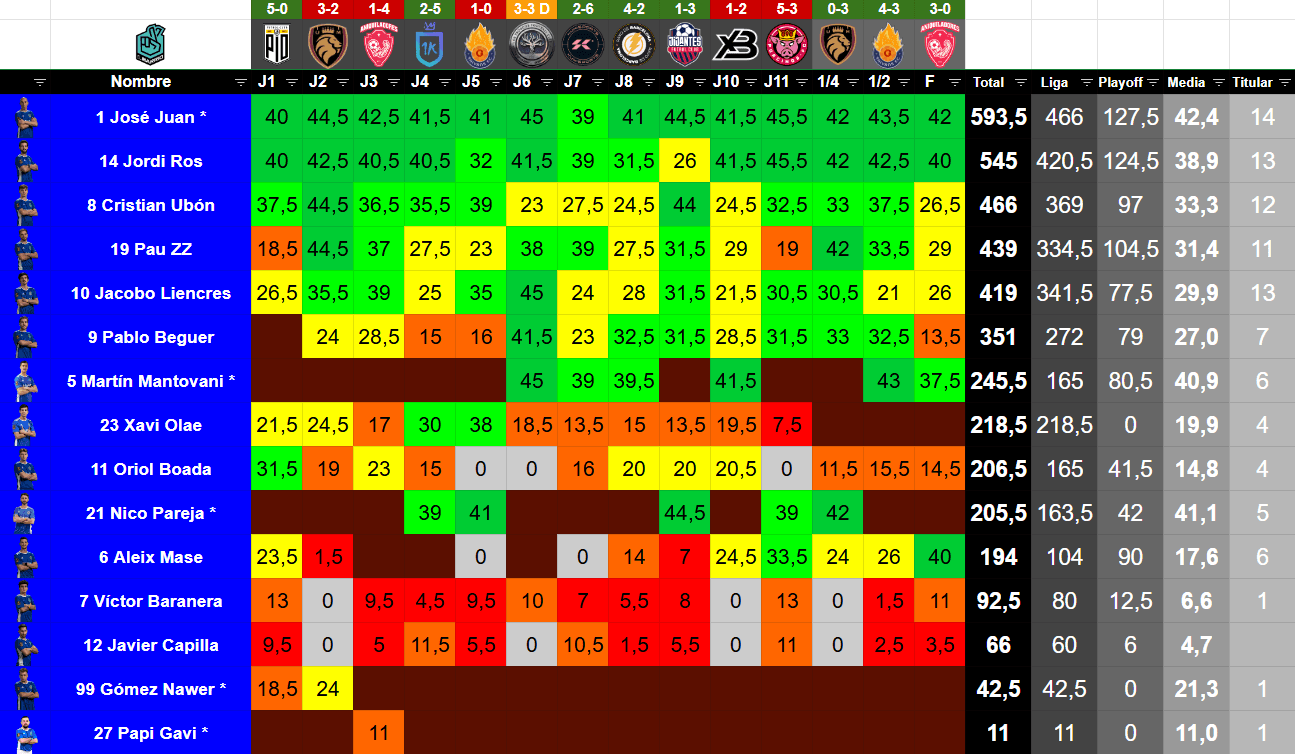 | 4 | Pau ZZ | Banda, Defensa | 27 | 48 | 439 | 14 | 1 | 3 | 1 | 0 | 1 | 1,78 | 57.14 | 7.14 | 35.71 |
