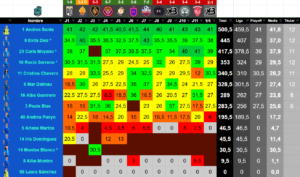 | # | Jugador | Posición | Edad | Valor millones | Minutos | Partidos | Goles | Asistencias | Amarillas | Rojas | MVP | Altura | % Victorias | % Empates | % Derrotas |