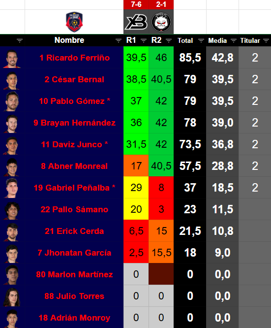 | 1 | Ricardo Ferriño | Portero | 34 | 42 | 85.5 | 2 | 0 | 0 | 0 | 0 | 0 | 1 | 0.00 | 0.00 | 100.00 |