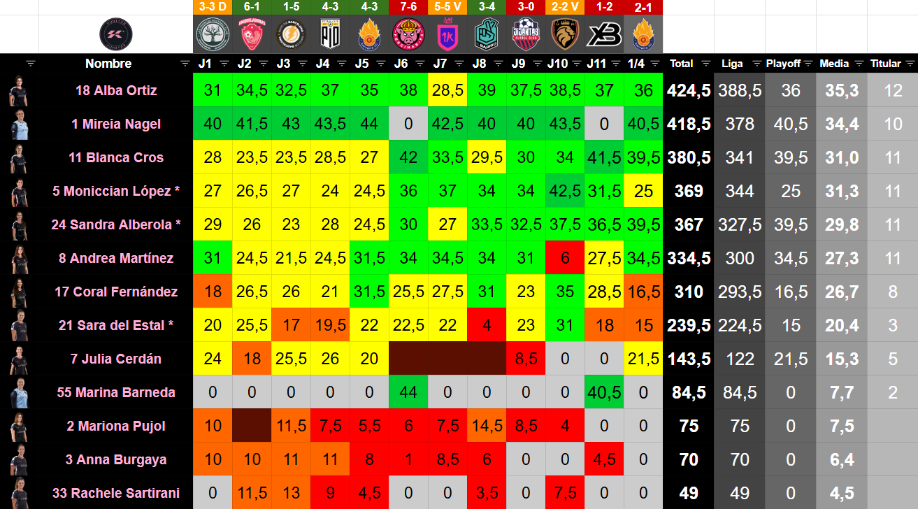 #JugadorPosiciónEdadValor TKMinutosPartidosGolesAsistenciasAmarillasRojasMVPAltura% Victorias% Empates% Derrotas