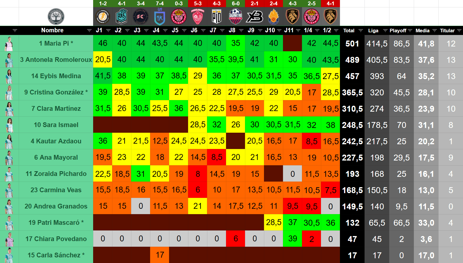 | # | Jugador | Posición | Edad | Valor TK | Minutos | Partidos | Goles | Asistencias | Amarillas | Rojas | MVP | Altura | % Victorias | % Empates | % Derrotas |