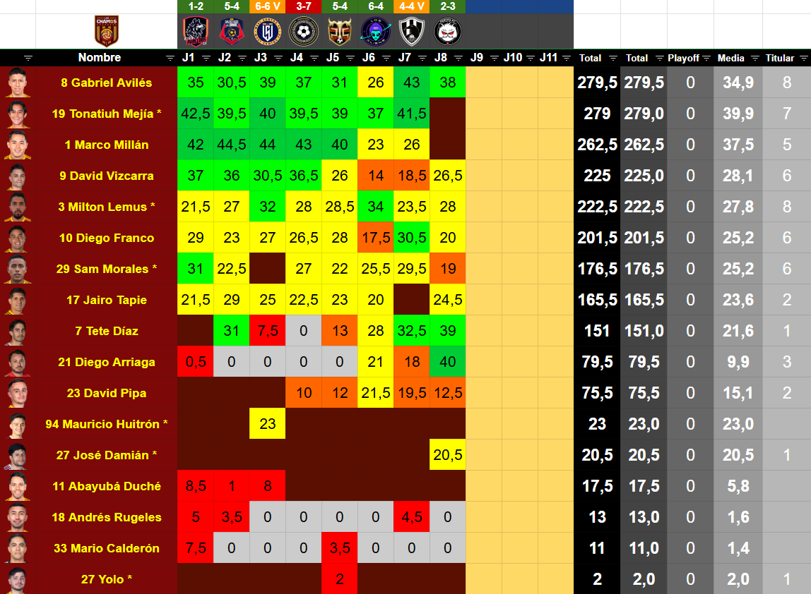 | 7 | Sam Morales * | Banda, Medio | 25 | 68 | 176.5 | 11 | 5 | 0 | 1 | 0 | 1 | 1,75 | 45.45 | 18.18 | 36.36 |