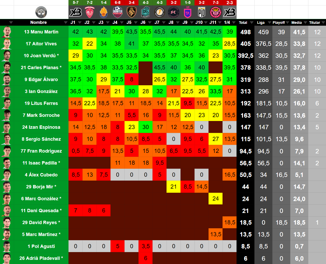 #JugadorPosiciónEdadValor TKMinutosPartidosGolesAsistenciasAmarillasRojasMVPAltura% Victorias% Empates% Derrotas