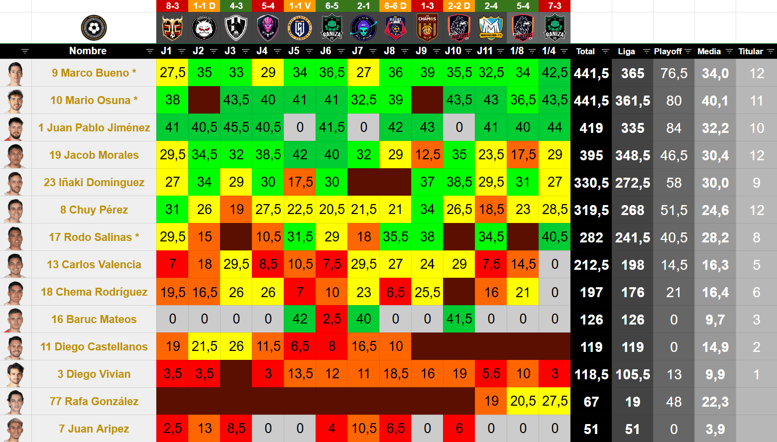#JugadorPosiciónEdadValor TKMinutosPartidosGolesAsistenciasAmarillasRojasMVPAltura% Victorias% Empates% Derrotas