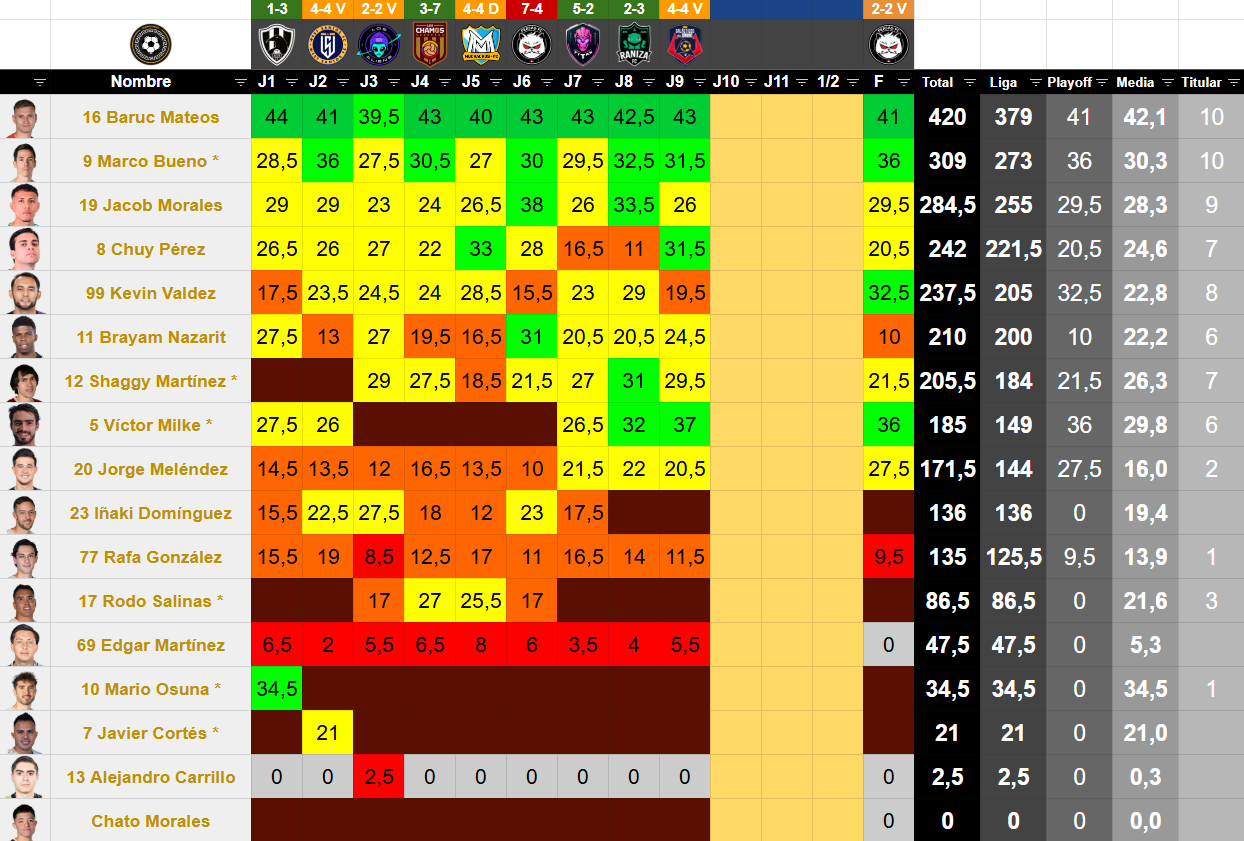 | # | Jugador | Posición | Edad | Valor TK | Minutos | Partidos | Goles | Asistencias | Amarillas | Rojas | MVP | Altura | % Victorias | % Empates | % Derrotas |