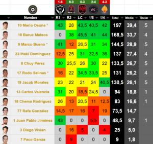 | 10 | Rafa González | Banda | 27 | 38 | 73.5 | 5 | 1 | 0 | 0 | 0 | 0 | 1,79 | 60.00 | 0.00 | 40.00 |