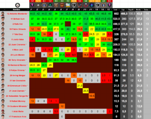 #JugadorPosiciónEdadValor millonesMinutosPartidosGolesAsistenciasAmarillasRojasMVPAltura% Victorias% Empates% Derrotas