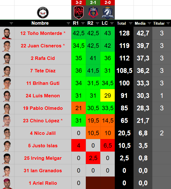 #JugadorPosiciónEdadValor TKMinutosPartidosGolesAsistenciasAmarillasRojasMVPAltura% Victorias% Empates% Derrotas