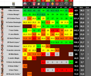 #JugadorPosiciónEdadValor millonesMinutosPartidosGolesAsistenciasAmarillasRojasMVPAltura% Victorias% Empates% Derrotas
