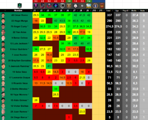 #JugadorPosiciónEdadValor millonesMinutosPartidosGolesAsistenciasAmarillasRojasMVPAltura% Victorias% Empates% Derrotas