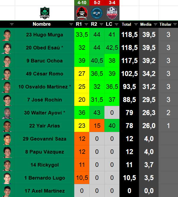 | 3 | Baruc Ochoa | Delantero | 24 | 96 | 117.5 | 3 | 2 | 3 | 0 | 0 | 0 | 1,76 | 33.33 | 0.00 | 66.67 |