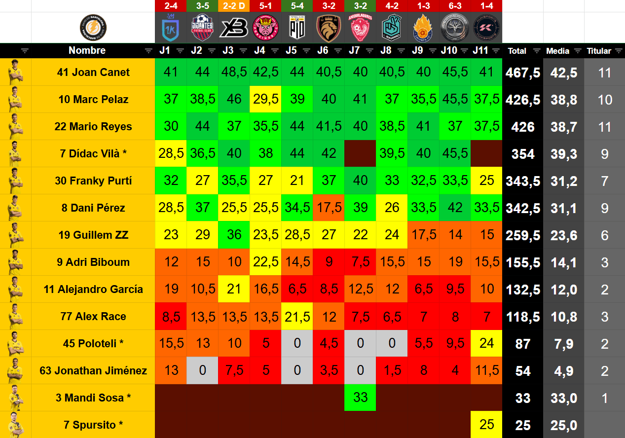 | 7 | Guillem ZZ | Banda, Delantero | 27 | 55 | 259.5 | 11 | 3 | 1 | 0 | 0 | 0 | 1,78 | 27.27 | 9.09 | 63.64 |