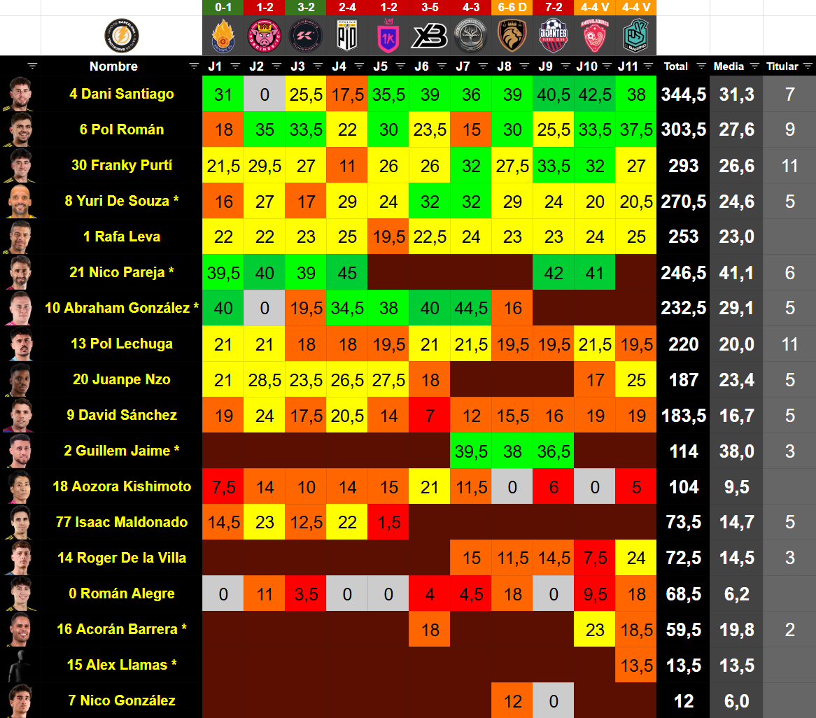 | # | Jugador | Posición | Edad | Valor TK | Minutos | Partidos | Goles | Asistencias | Amarillas | Rojas | MVP | Altura | % Victorias | % Empates | % Derrotas |