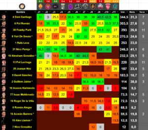 | 1 | Dani Santiago | Defensa | 24 | 71 | 344.5 | 10 | 0 | 2 | 1 | 0 | 0 | 1,88 | 20.00 | 30.00 | 50.00 |