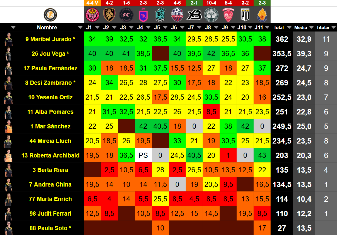 | 5 | Yesenia Ortiz | Banda, Medio | 20 | 60 | 252.5 | 11 | 6 | 0 | 0 | 0 | 1 | 1,57 | 18.18 | 9.09 | 72.73 |