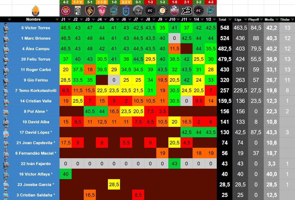 | 3 | Álex Campu | Defensa | 25 | 51 | 482.5 | 12 | 1 | 3 | 1 | 1 | 0 | 1,79 | 50.00 | 25.00 | 25.00 |
