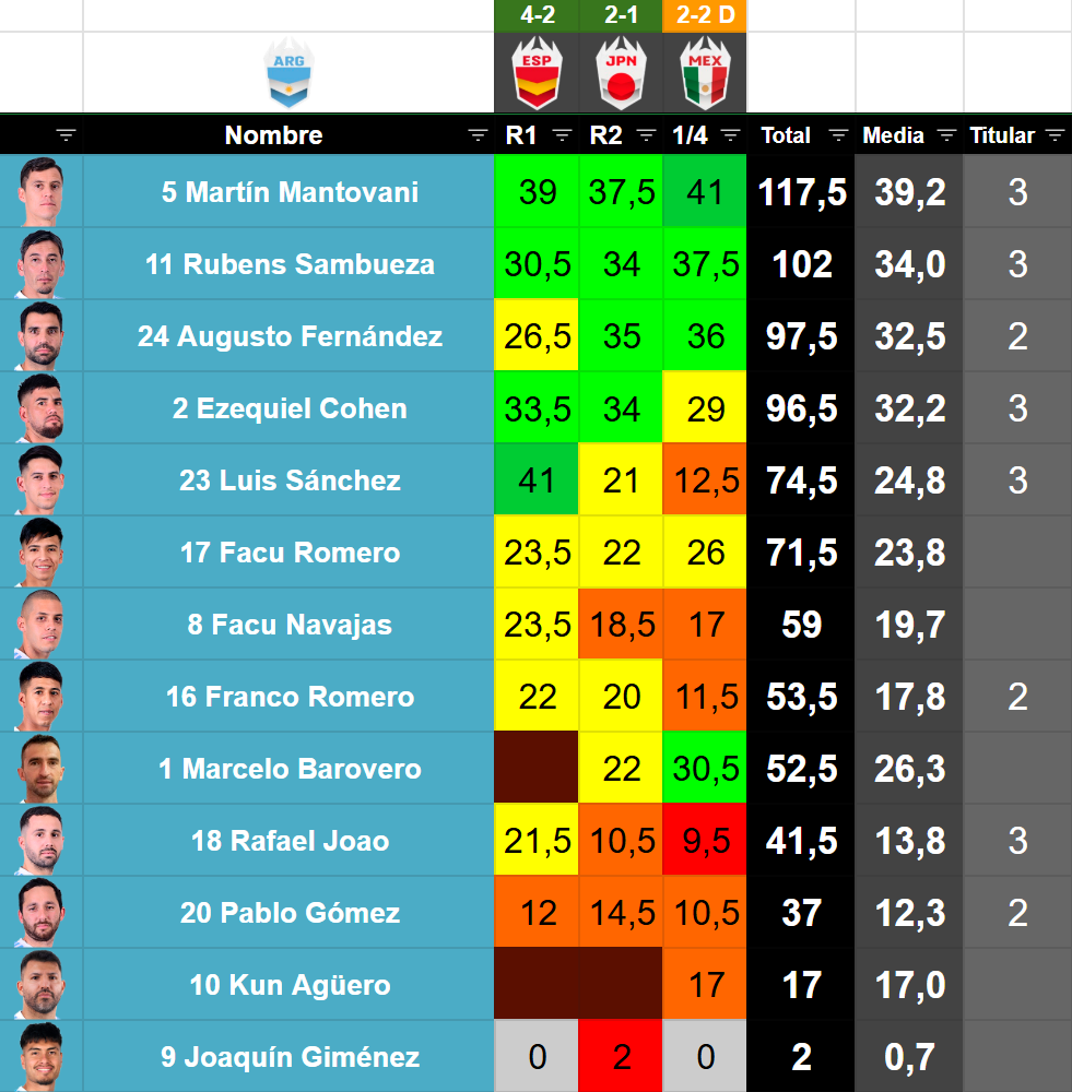 | # | Jugador | Posición | Edad | Valor TK | Minutos | Partidos | Goles | Asistencias | Amarillas | Rojas | MVP | Altura | % Victorias | % Empates | % Derrotas |