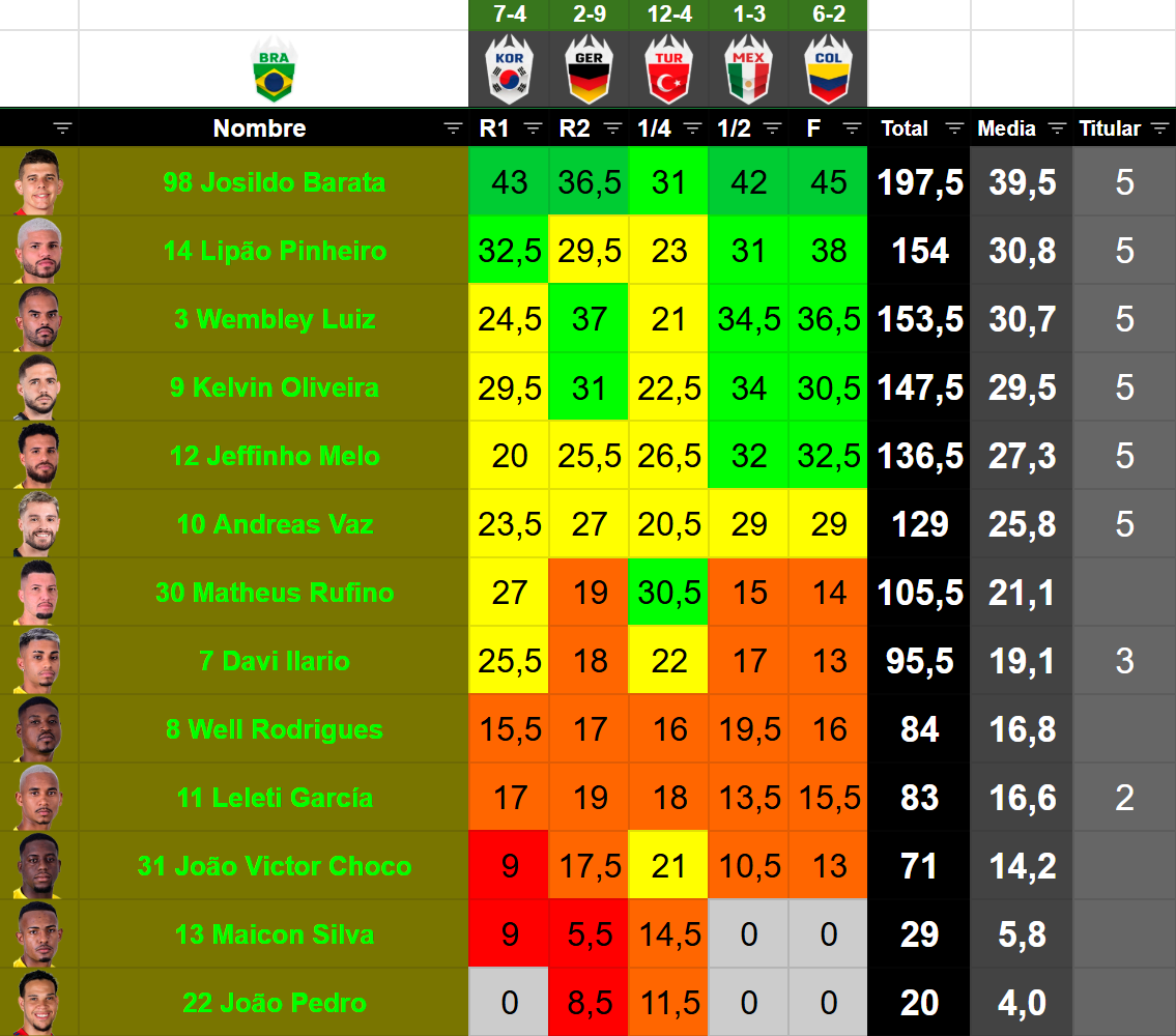 #JugadorPosiciónEdadValor TKMinutosPartidosGolesAsistenciasAmarillasRojasMVPAltura% Victorias% Empates% Derrotas
