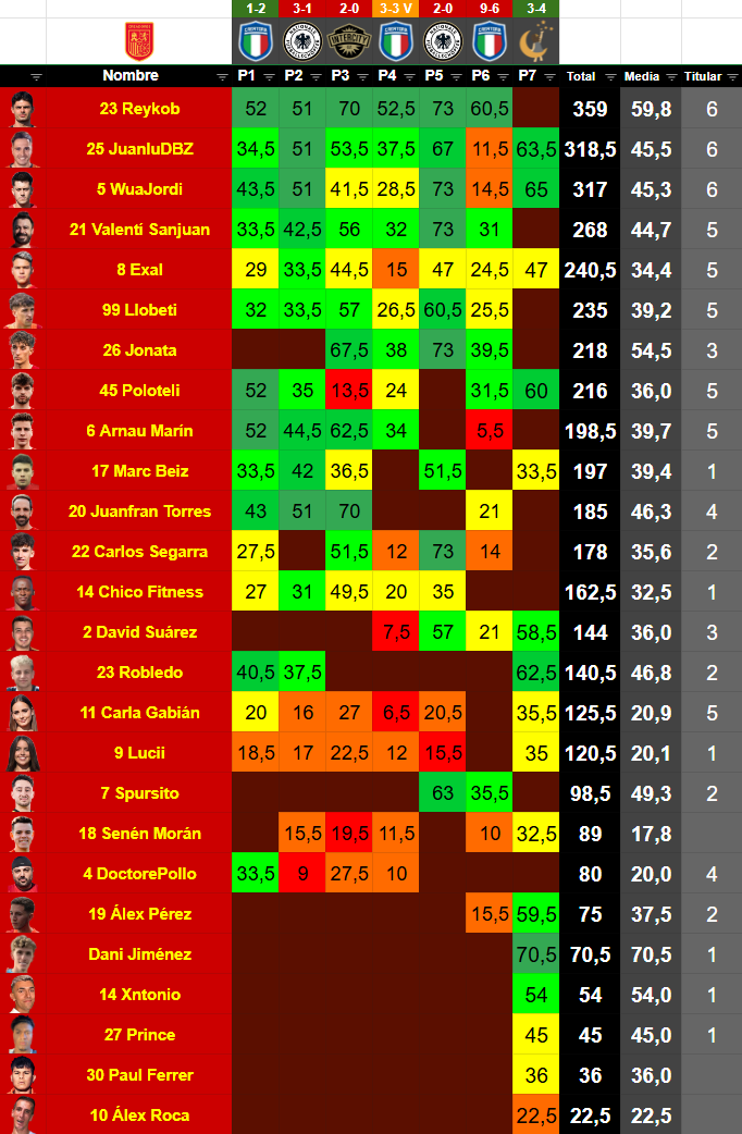 #JugadorPosiciónEdadMinutosPartidosGolesAsistenciasAmarillasRojasMVPAltura% Victorias% Empates% Derrotas