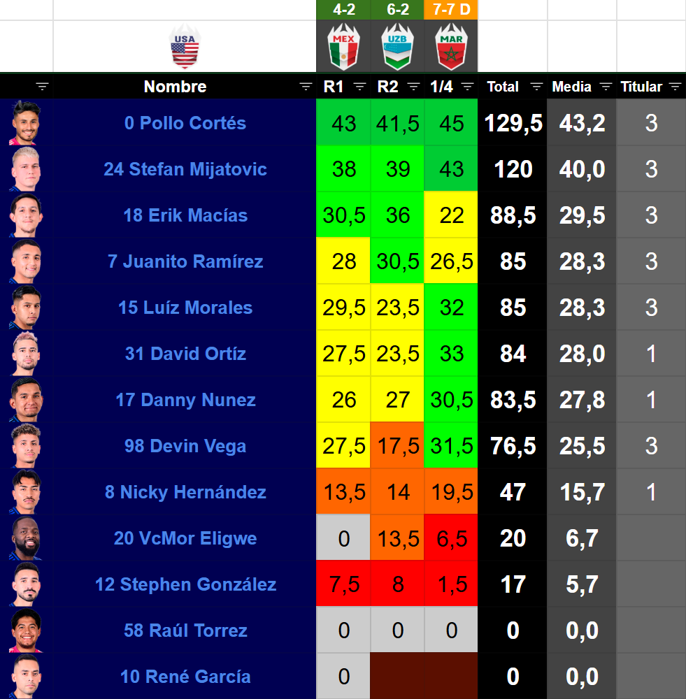 #JugadorPosiciónEdadValor TKMinutosPartidosGolesAsistenciasAmarillasRojasMVPAltura% Victorias% Empates% Derrotas