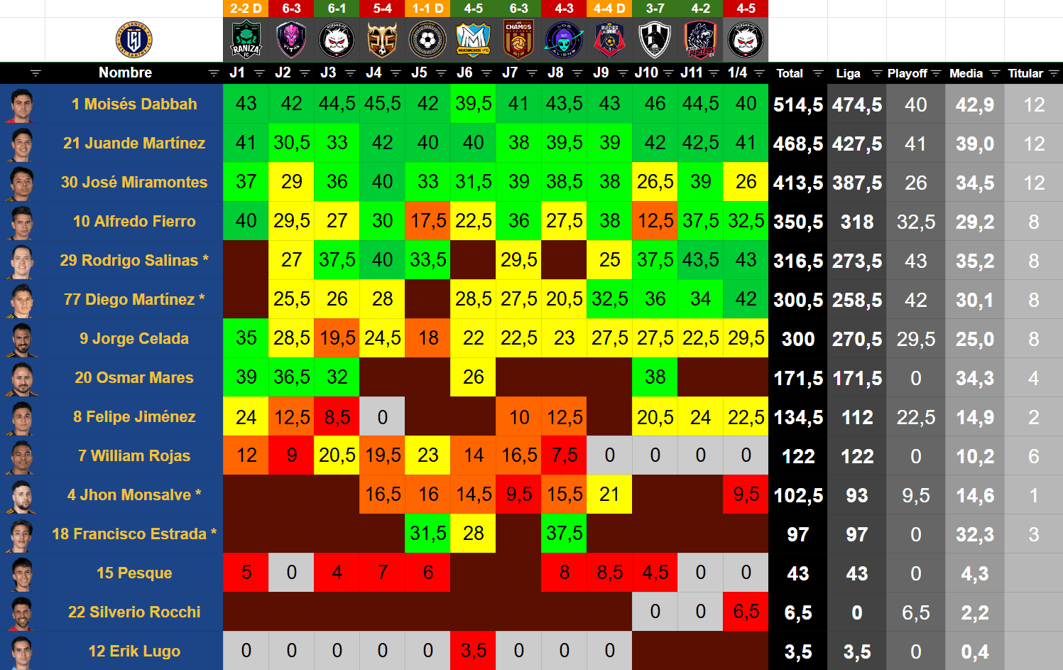 #JugadorPosiciónEdadValor TKMinutosPartidosGolesAsistenciasAmarillasRojasMVPAltura% Victorias% Empates% Derrotas