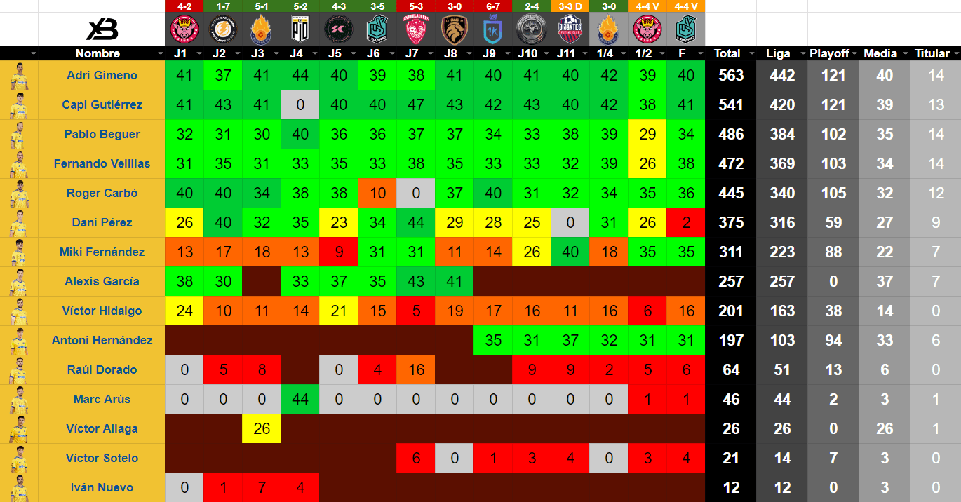 | 4 | Fernando Velillas * | Medio | 39 | 115 | 472 | 14 | 6 | 4 | 0 | 0 | 1 | 1,73 | 50.00 | 21.43 | 28.57 |