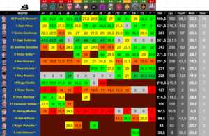 | # | Jugador | Posición | Edad | Valor millones | Minutos | Partidos | Goles | Asistencias | Amarillas | Rojas | MVP | Altura | % Victorias | % Empates | % Derrotas |