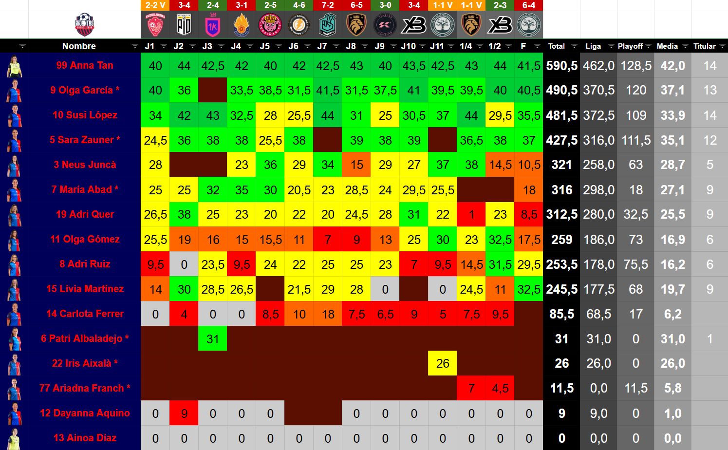 Minutos jugados y valores de los jugadores de la Kings League